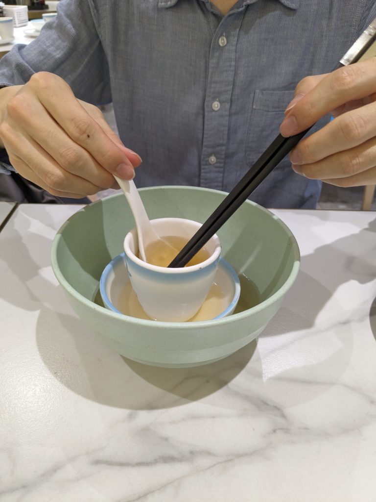 香港スタイルの食器類をお茶(お湯)で洗浄する作業をやっている夫の姿です。
