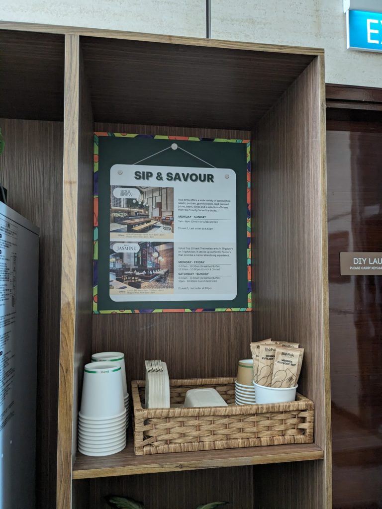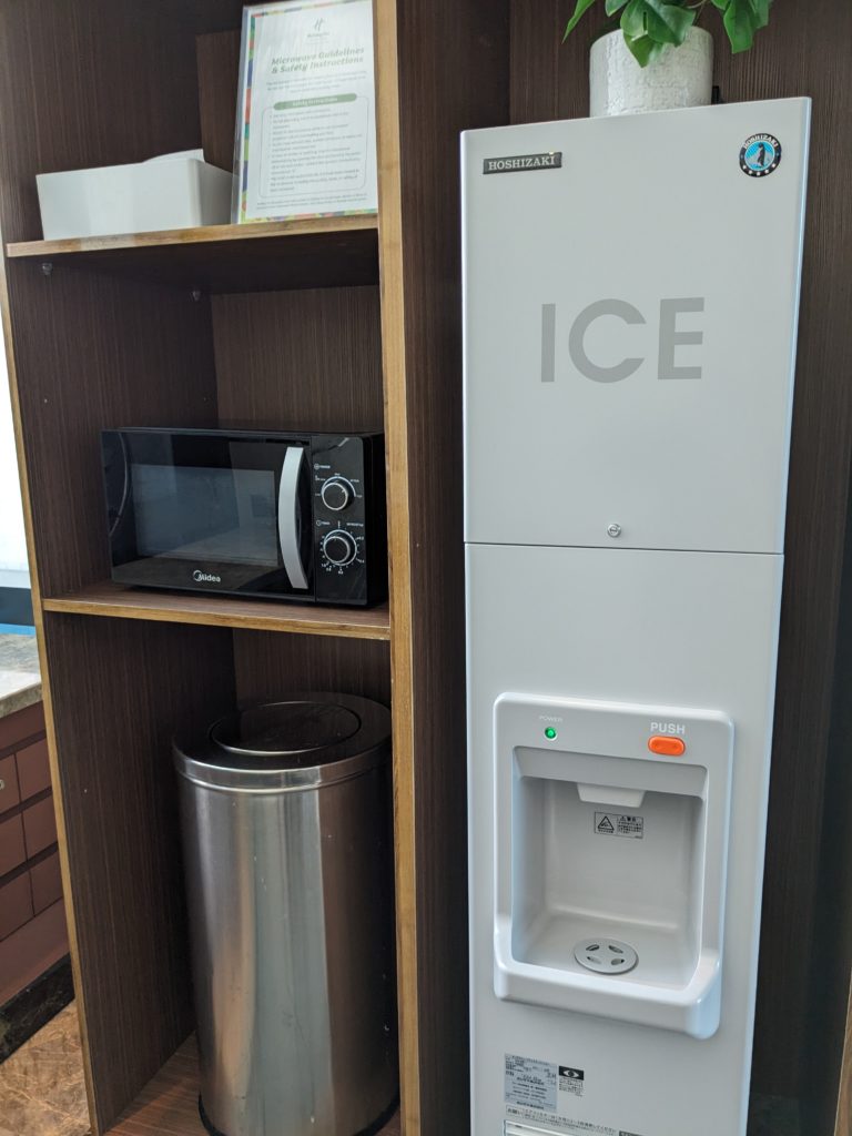 ランドリーに入る前のちょっとしたスペースには、電子レンジ・ウォーターサーバー・持ち帰り用のカップや使い捨てのスプーンなどがありました。