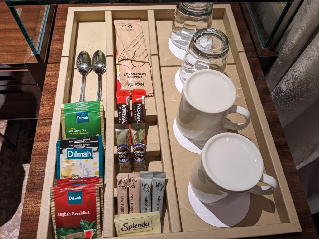 サイドテーブルの隣には冷蔵庫とお茶コーナー。飲み物の種類が豊富でした。ハーブティーまであるのはさすが!