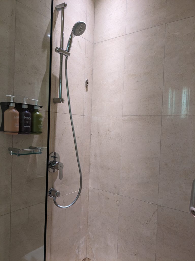 ごくごく一般的なシャワー室です。シャンプー、コンディショナー、ボディソープ揃ってます。