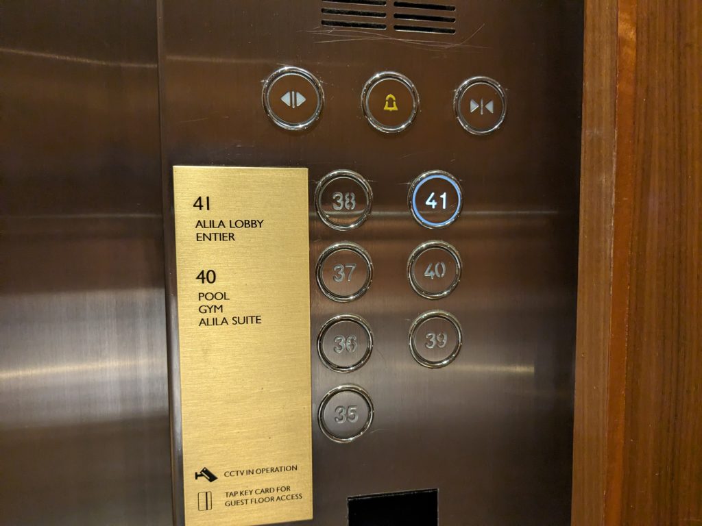 というのは、まず最寄駅または1階のホテル入り口から一つ目のエレベーターに乗り、ホテルのロビーがある階でいったん降ります。そこから今度は別のエレベーターに乗って、客室に向かう…というタイプのホテルだからです。