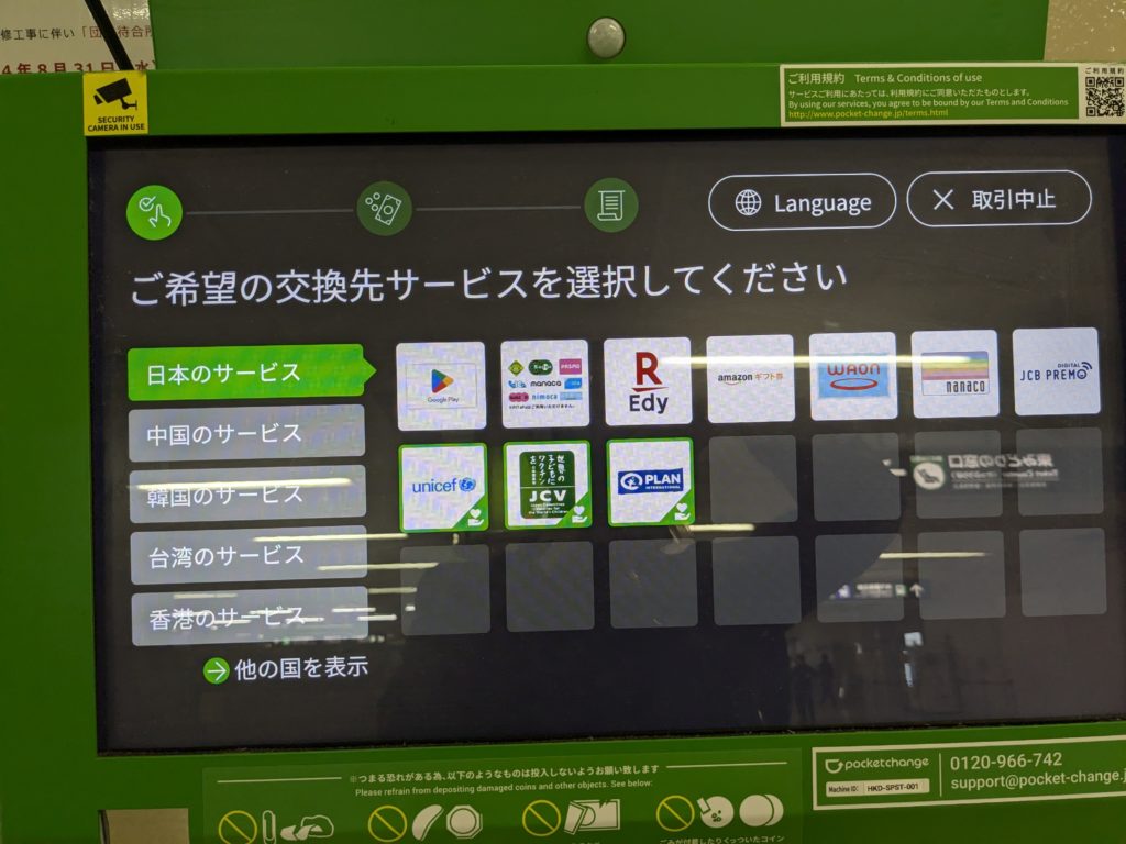対応されている外貨は両替できますが、不明なコインは返却または寄付どちらかを選択することができました。