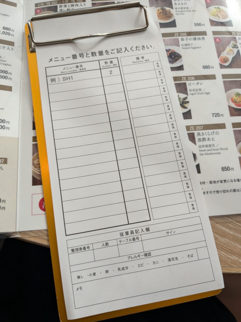 この注文用紙にメニューの番号と数量を書いて、店員さんに渡すだけです!