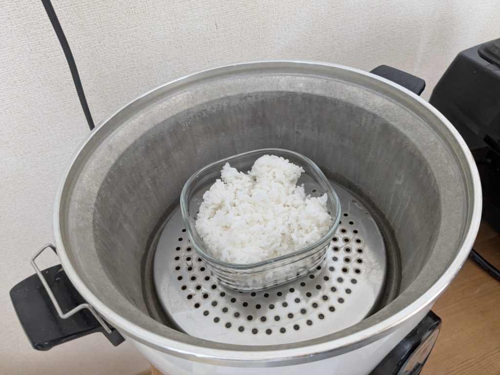 まず蒸し板を敷いてそこにご飯を置きます。このご飯は冷凍ごはんで、朝起きたら冷凍庫から出しておいたものです。
