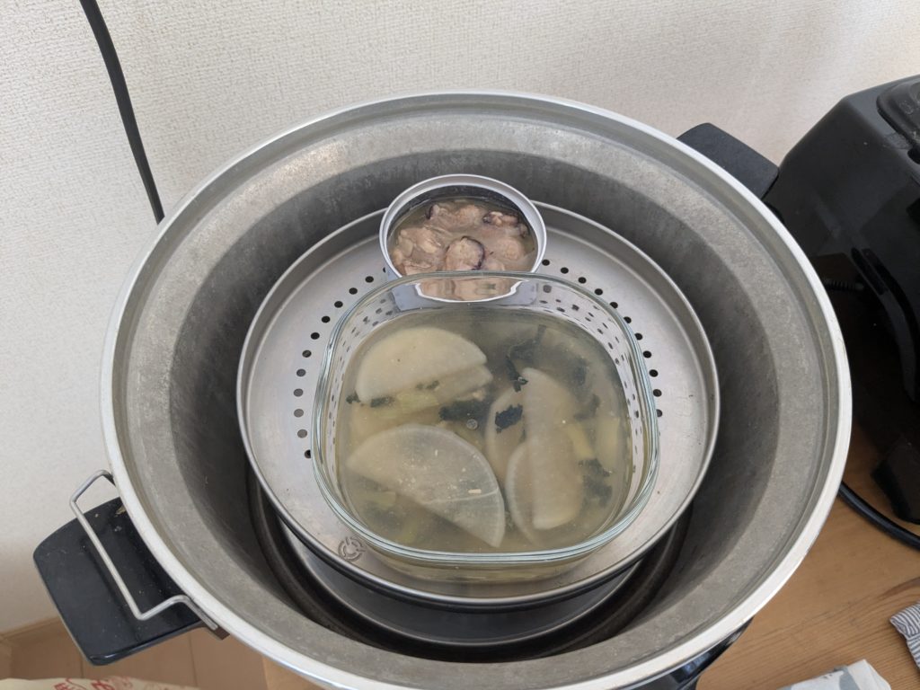 2段目の蒸し板の上には牡蠣のレモン漬け?みたいな缶詰&前日に作った味噌汁を載せました。
