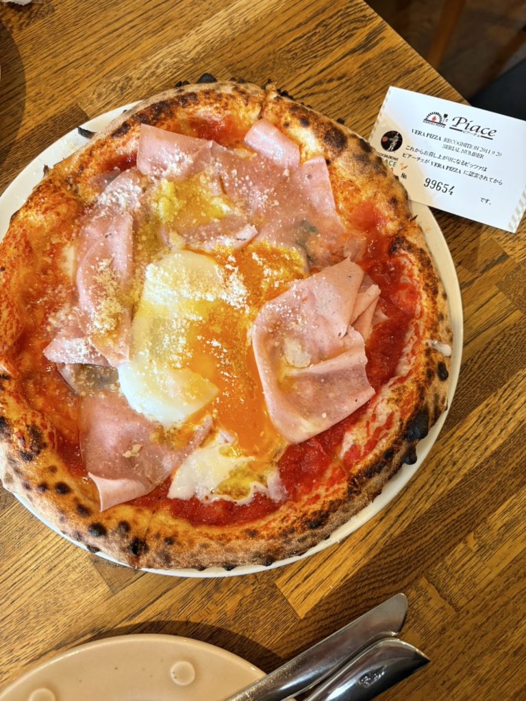 以前、夫が海外でこのピザを食べておいしかったそうで、私は初めて食べました。見ての通り、半熟卵なので食べにくいことは否めません😅でも、そのデメリットにも負けないうまさでした。