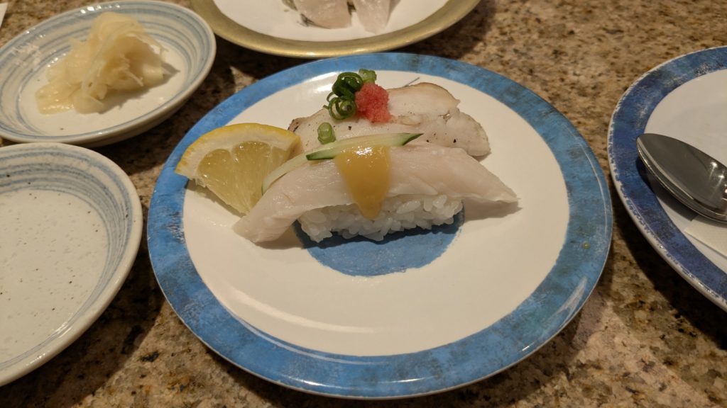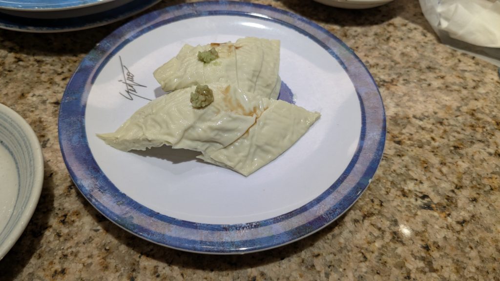 この日はえび3種・炙りサーモン・茶碗蒸し・湯葉などをいただきました。湯葉寿司はあなどることなかれ、おいしかったです。そんなに厳格でないベジタリアンの人だったらこれもいいですよね。