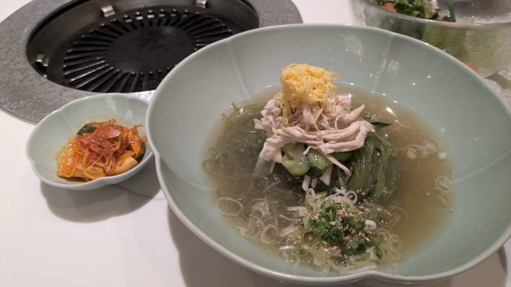 私は盛岡冷麺を食べたことがあるので、ちょっと変わったやつをと思い、桑の葉入りの冷麺にしました。小鉢に入っているキムチと合わせて食べるのもいいですが、そのまま食べるほうが好みでしたね。