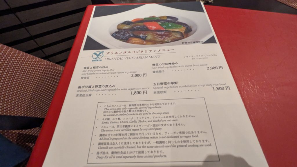 こちらのレストランにはオリエンタルベジタリアンメニューがあります。五葷(たとえばニンニクとかニラ)を使わない料理がメニューにある中華料理店は初めて見ました。