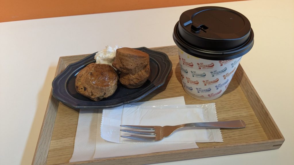 コーヒーとスコーンのセットを頼みました。スコーンは小ぶりです。味が何種類かあってひとり1個ついてきます。