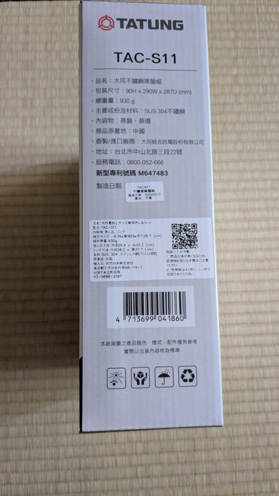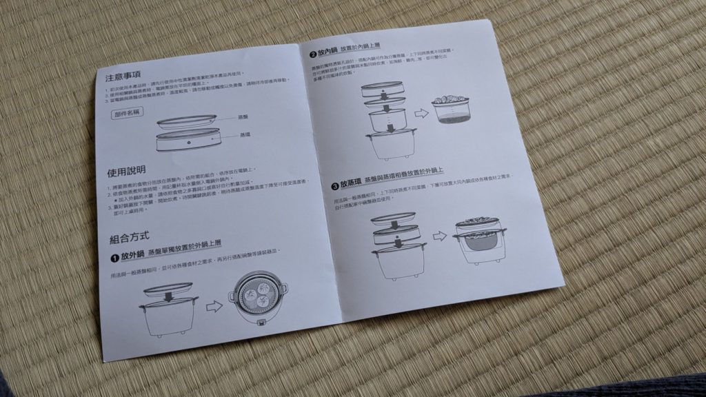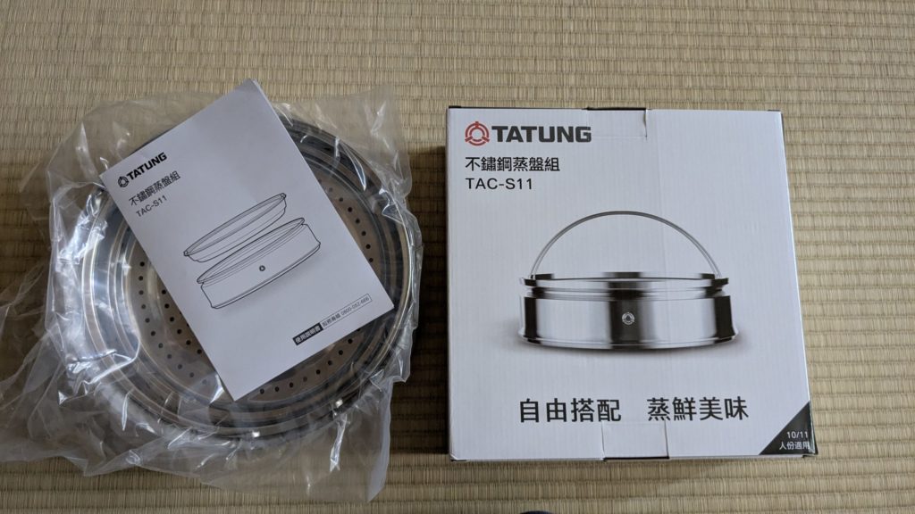 蒸し皿セットはこんなふうに台湾仕様の箱に入って届きました。日本語表記もちゃんとあるので大丈夫です。説明書は日本語じゃなかったので、必要な人は公式サイトから日本語説明書PDFがダウンロードします。