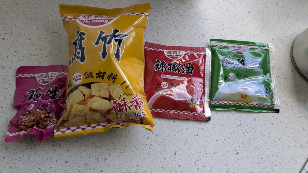 中国語で螺丝(るおーすー)はタニシ、粉は米粉麺(ビーフンって私たちはいいますかね)という意味です。タニシって田んぼにいるやつ?日本人にはあまり馴染みがないけど、中国ではよく食べるんだろうか?