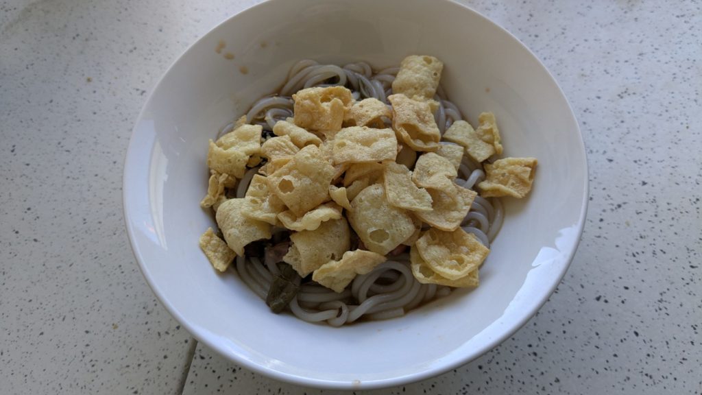 麺のほうは箸でぷちっと切れるくらいのやわらかさ、少し辛いスープの素でさっぱりしながら、トッピングのサクサク感も合わさって意外とおいしかったです。